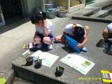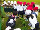 1,2年生が一緒に畑に野菜の苗を植えました。3人ずつのグループに分かれて、ナス、...