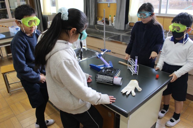 理科では、実験を行いました。安全のため「ほごめがね」をつけての実験です。水のあた...