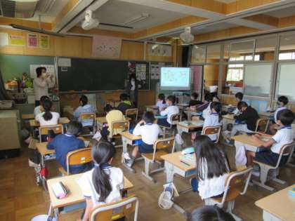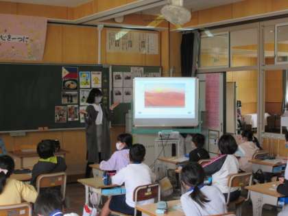 今年度、ALTが新しい方になりました。今日は4年生が外国語活動です。海外の様子を画像で見ながらの授業の始まり。何を学んだかな?