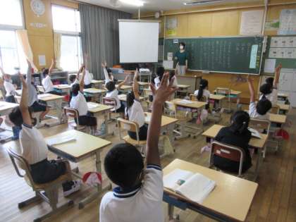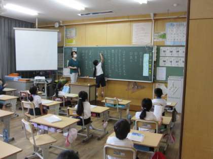 2年生の国語です。黒板に掲示された文章から、決められた文字を探す活動です。きちんと読めば見つかる活動です。一生懸命探して答える2年生です。