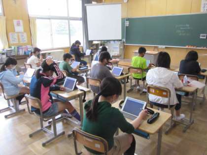 遠足を延期にした朝、各学級では、初のオンライン朝の会に挑戦しました。6年生は職員室と教室に分かれて実施、健康観察まで行いました。初めてのことで戸惑いもありましたが、6年生のお助け隊が登場し、支援をしていました。