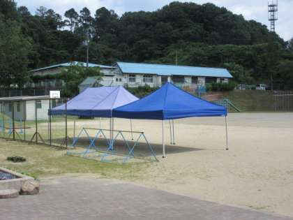 避難所といっても暑さ除けです。運動場に暑さ対策用テントを張りました。また、体育の時間は昇降口まで各自水筒を持参し、こまめに水分を取っています。