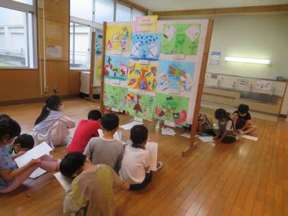 「ふしぎなたまご」からいろいろなものが生まれる様子をクレヨンで描きました。完成した作品を見ながら、友達の作品のよいところをたくさん見つけることができました。