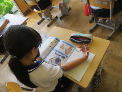 乾電池のつなぎ方について考えていました。理由を書くことに苦戦していると、担任の先生がヒントをくれました。すると、教科書で確認したり、友達と相談したりして,自分の考えをさらに深めることができました。
