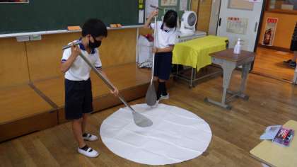 北部給食センターの栄養教諭の先生をお迎えし、1年生が給食についてお話を聞きました。写真を見たり、実際の鍋の大きさを体感したりしながら、毎日の給食について知ることができました。