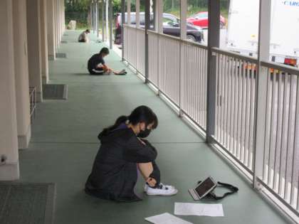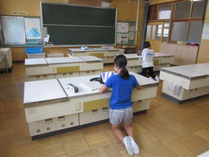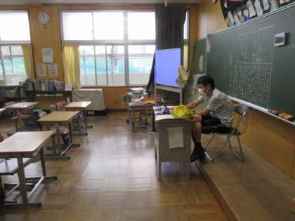 4月から学習用タブレットを活用した学び合いに学年に応じて取り組んできました。今日はもしかに備えて、学校内でオンライン授業を実施しました。(6年生)担任は教室で、子どもたちは各所に散って算数の授業を行っています。(画面をずっと見ているのは辛い?!〉