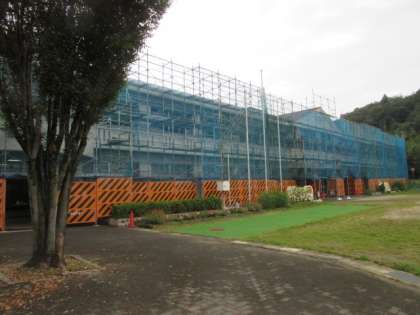 また雨です。お盆のころの長雨にも驚きましたが、この時期の雨も珍しい感じです。校舎は保全改修のため足場で覆われていますが、換気扇やサーキュレーターを駆使して換気を図っています。