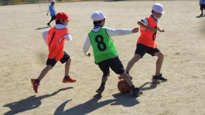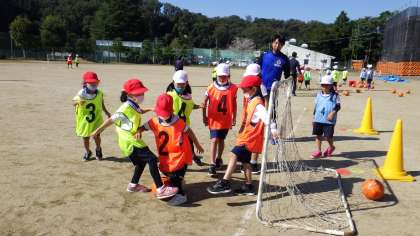 ボールに慣れる運動やシュート練習をした後、チームに分かれて試合をしました。