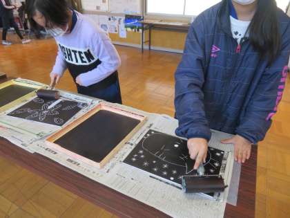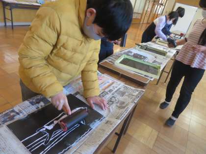 4年生が木版画の「刷り」を行っていました。彫刻刀で彫った絵がどのような作品になっているかは、刷ってみないと分かりません。