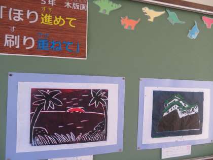 5年生は多色刷りに挑戦。作品が廊下に飾られています。