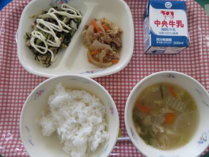 2年生から6年生は、去年の学級の配膳のやり方を新しい担任の先生に伝えながら準備をしました。