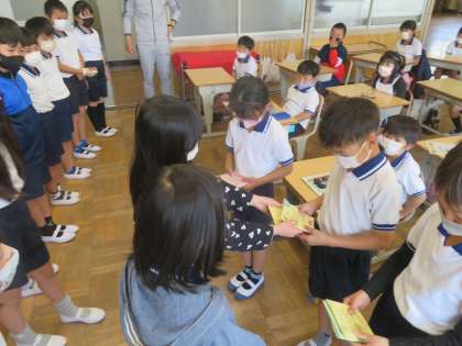4年生が去年、自分たちが理科の時間に育てた植物の種を3年生にプレゼント。