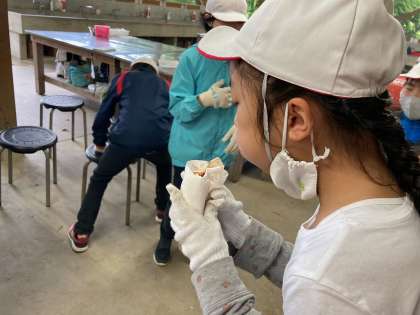 今年のある日、学校のベランダで乾燥させていると、6年生が「雨が降ってきた。もぐさが濡れる!」と5年生のもぐさを片付けたそうです。去年、火起こしに苦労した自分たちの経験があるからこそ、この行動が生まれたのでしょう。