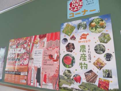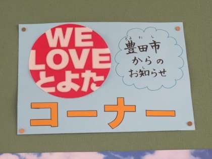 図工室に向かう廊下に「WE LOVE とよた」コーナーがあります。これは、豊田市からのお知らせポスターを掲示するスペースです。