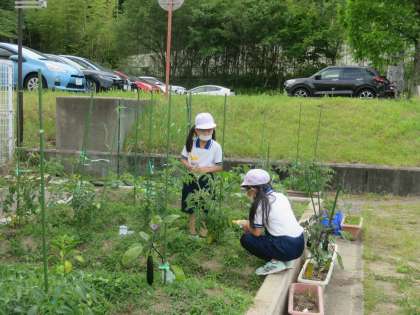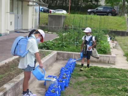 登校後、学校の畑に水やりをしている子どもたちを見かけました。大畑小学校では、栽培活動を、豊かな心を育成する活動に位置付けています。生活科や理科の学習としてだけでなく、校内整備員や地域ボランティアの方と関わりながら栽培活動に取り組めるように工夫しています。