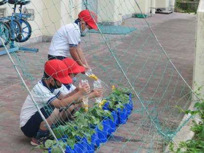 この日は、4年生のツルレイシのために2階のベランダまで届くネットを見て、3年生の子どもたちが「本当にこんなに伸びるのかな?」と話していました。お互いの畑が近くにあることで、子どもたちの興味や関心も広がっていきます。
