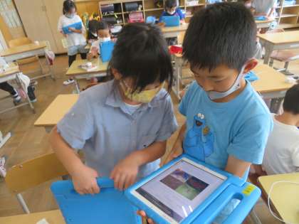 ある日、子どもたちに「今日はまなびリンクを自由に見ていいよ」と時間を与えると、最初は「何を見ていいか分からない」という子もいました。しばらくそれぞれに学習用タブレットを見ていましたが、「先生、去年、僕たちが行った自然観察の森があるよ」という言葉に、「どこ?」「見たい」と子どもたちの関わりが急に生まれていきました。「〇〇さんは去年、行けなかったね」とお休みした友達を思いやる優しい言葉も聞こえてきました。