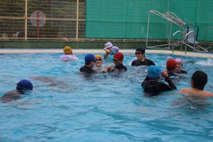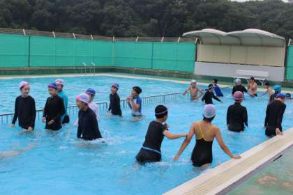 5・6年生も、最初は低学年プールで水に慣れることから始めました。曇り空の日でしたが、安全に気をつけながら、3年ぶりの水泳学習を行うことができました。