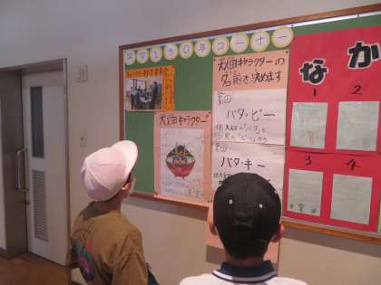 大畑キャラクター制作委員会は高学年有志による活動です。夏休み前から話し合いを重ねていました。活動を通して見つけた地域の宝が全校に広がっています。