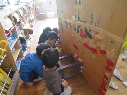 1年生が、大畑フェスティバルに使う道具を協力して作っていました。何を作っているかは当日のお楽しみですが、その裏側には、1年生が自分達で一生懸命にガムテープをたくさん貼ったことを紹介します。