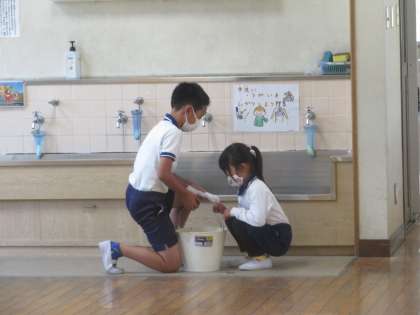 縦割り班そうじでは、高学年と低学年がいっしょに取り組んでいます。言葉で説明するだけでなく、「いっしょに」やることで、高学年も低学年もお互いに学びがあります。「いっしょに」やることで、一人では味わえない、楽しさや嬉しさが生まれます。