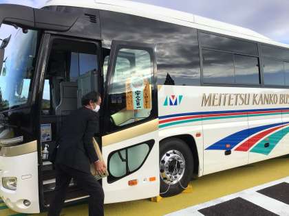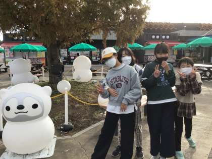 トイレ休憩に立ち寄りました。全員元気です。5年生が作ってくれたお守りが目印になってバスを見つけやすいです。5年生のみんなありがとう!