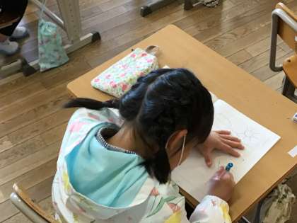 正しい鉛筆の持ち方やよい姿勢を確認した後、鉛筆を持って線をなぞる練習をしました。みんな真剣です!