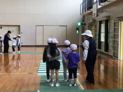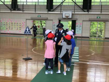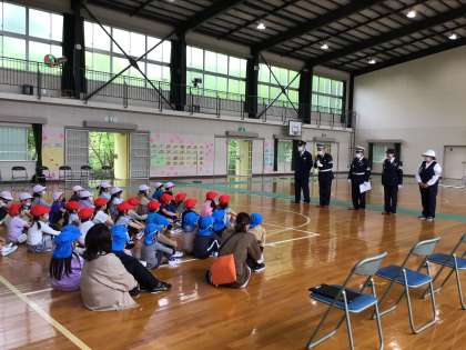 駐在さん、交通指導員の皆さんに来ていただき、交通安全教室を行いました。大畑こども園のお友だち、1年生、2年生が横断歩道の渡り方や雨の日の歩き方などを学びました。自分の命を自分で守れるように、安全に気を付けて生活しましょう。