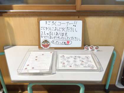 教室やお家で遊べるように、「ばたっぴぃ」すごろくコーナーを保健室前に作りました。