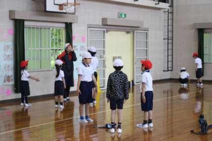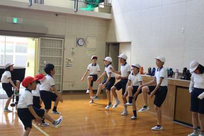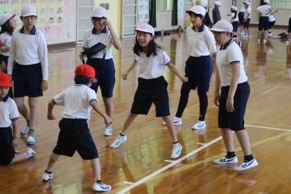 体育で1、2年生は、6年生に「リズムジャンプ体操」を教えてもらいました。なかよし班のグループに分かれて練習をし、班ごとに動画を見たり、一緒に踊ったりしました。最後には、6年生の上手に体操をする姿を見て、1、2年生から拍手がわいていました。
