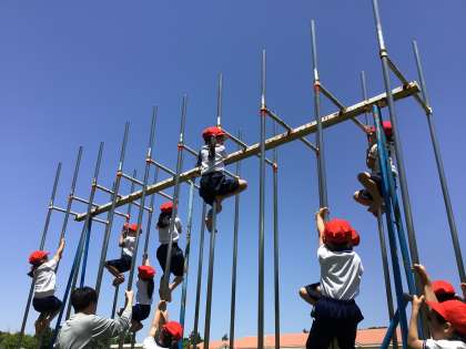 火傷をしないように降り方の確認を再度してから、登り棒の登り下りをしました。登り棒に30秒間しがみつく「30秒チャレンジ」では、自分が登ることができる高さまで登り、ぎゅっと登り棒をつかんで頑張りました。