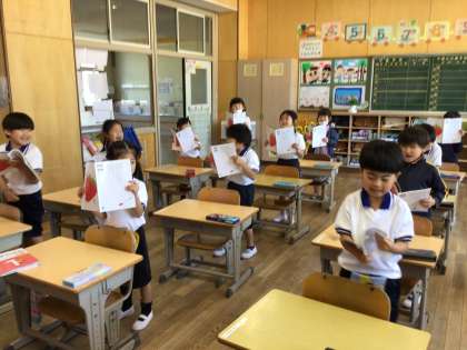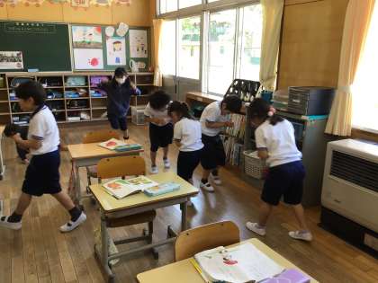 「あめですよ」の音読練習で、登場人物の気持ちを想像しながら教室内を歩きました。雨が大好きな登場人物はとびきりの笑顔で、雨が嫌いな登場人物は頭を下げて元気がない様子で歩いていました。音読も体を使って表現できますね。