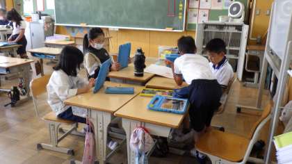 愛知県の特産品や生き物など、愛知県の特徴的なものについて、学習用タブレットを使って調べました。調べたことをパワーポイントや画用紙にまとめています。