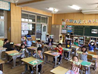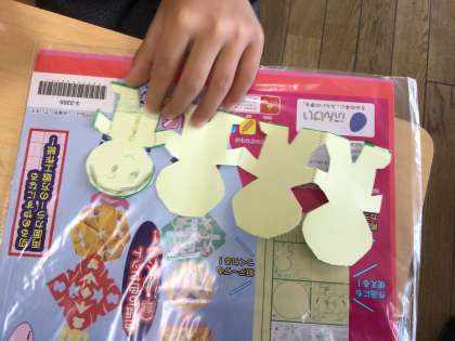 前回の図画工作科の授業に続いて、はさみを使って活動しました。紙を重ねてはさみで切るのは少し難しかったようですが、手をつないでいる4人組のお友達を上手に作ることができました。