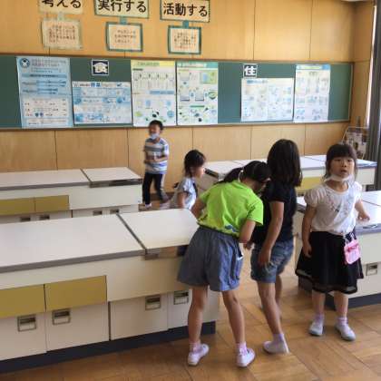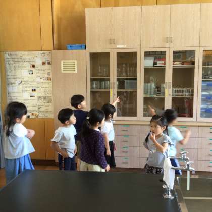 学校探検第一弾です。先日の生活科の授業で、「これはどこにあるでしょう」のクイズをしました。ミシン糸、電流計、のこぎり、ブックスタンドなどがどの部屋にあるのかを話し合い、想像して、学校探検に出かけました。「あった!」「見つけたよ」などと言いながら、探検しました。