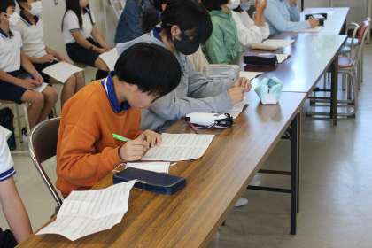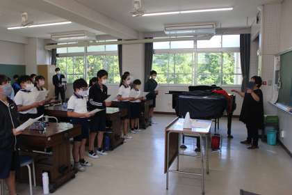 合唱指導の先生に来ていただき、校歌の歌い方を学びました。歌詞の意味を考えたり、発声の仕方を教えてもらったりしました。ここでの学びを全校に広げていこうと、意欲をもって取り組んでいます。