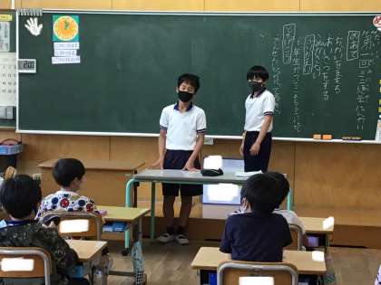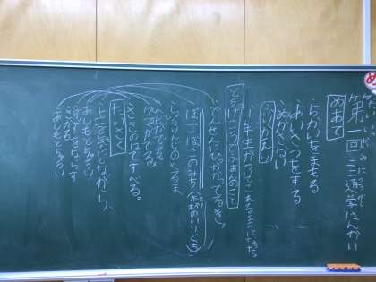 みんなが安全に登下校できるように、めあてを確認をしたり、通学路で危ないところを出し合ったりしました。司会の6年生は、1年生でも分かるように、言葉を選んで話したり、板書の文字にふりがなをふったりしていました。