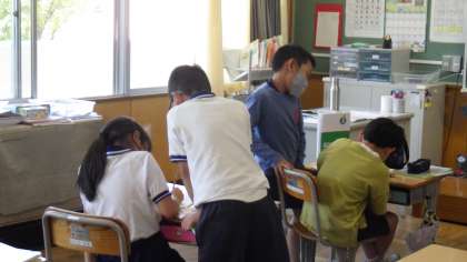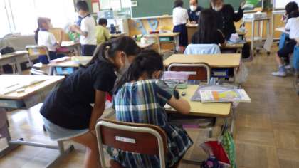 算数の授業中、「算数の友」の問題に取り組みました。分からないところがあると教えてもらったり、教えることで覚えたことの理解を深めたりして、学び合いができていました。