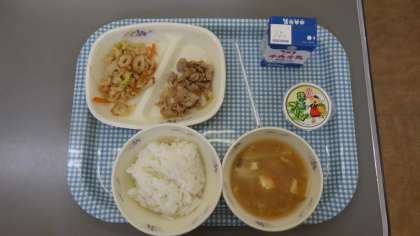 今日の給食は、「とよたブランドの日」メニューでした。「とよたひまわりポーク」の生姜炒めや豊田市内で採れた抹茶を使用した「抹茶プリン」が出ました。