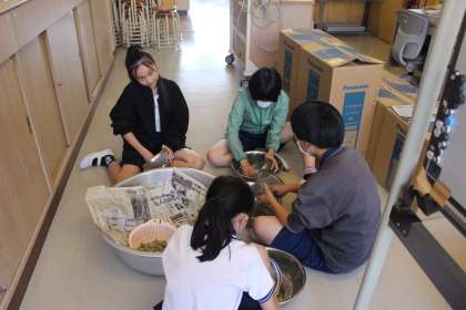 5年生にキャンプの火おこしで使う、もぐさの作り方を伝え、一緒にもぐさ作りを行いました。自分たちが学んだきたことを、下の学年に伝えていくことは大切ですね。