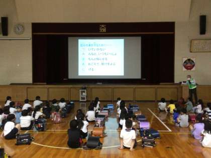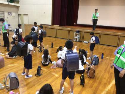 本日、防犯教室を行いました。防犯ブザーの使い方を学んだり、『つみきおに』について学んだりしました。大声で助けを呼ぶ練習も行いました。自分の身は、自分で守るということを学ぶことができました。