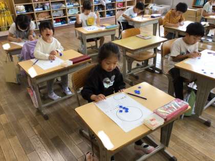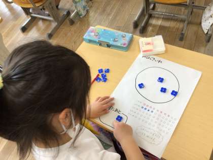 おはじき入れをしました。10個のおはじきを順番にはじいて、枠の中に入れます。次の算数では、今日の結果を使って、10がいくつといくつに分かれるかをを考えます。楽しみですね。