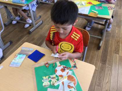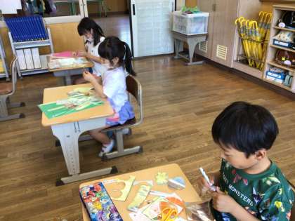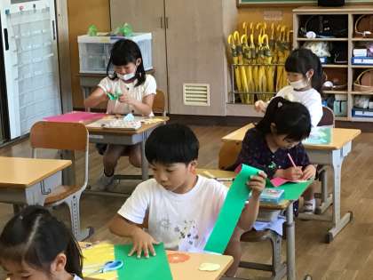 ちょきちょきかざりを作りました。色のついた紙を折ってから切ったり、油性ペンで形を描いてから切ったり、工夫を凝らしてパーツを作りました。「花火ってどうやって作るの」「教えてあげようか」などと教え合いながら取り組む子たちもいました。