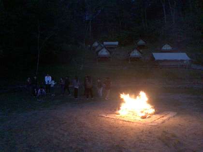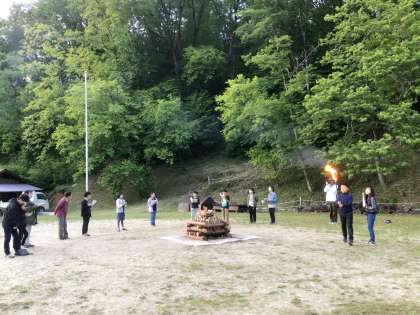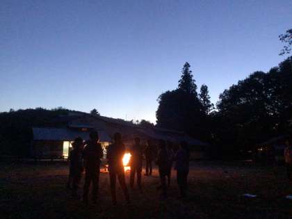 薪木に点火後、火の近くで、班で考えたスタンツをしました。