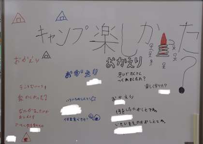 キャンプを終え、学校に帰ると、全校のみんなから素敵なメッセージと絵が教室中にかかれていました。子ども達は、そのメッセージを見て、温かい心あふれる大畑小学校に無事に帰ってきたと実感していました。