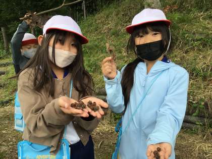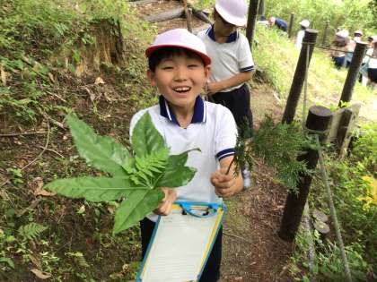 大畑の森へ、生き物や植物を見つけに行きました。今後、学習用タブレットを使って見つけた植物について調べ学習をしていきます。