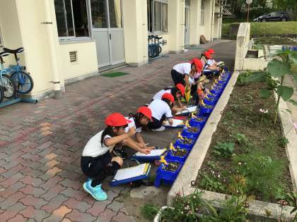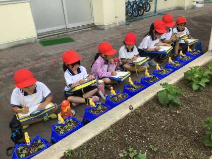 生活科の授業で、アサガオの観察をしました。芽が出ている様子を見て、みんな嬉しそうでした。