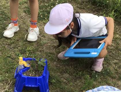 2年生が育てている夏野菜の観察をしました。学習用タブレットで成長を記録しています。