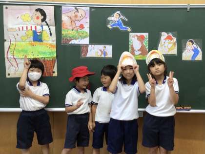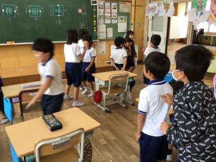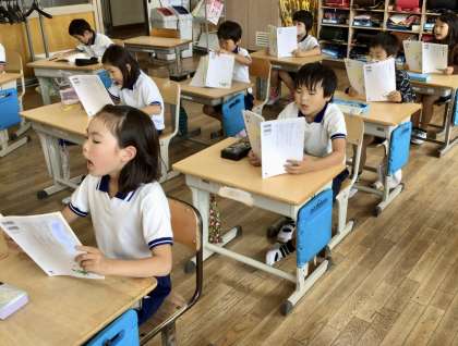 2年生は帯学習で漢字の練習をしています。新しい漢字を学習したときは、書き順を覚えるために友達同士が背中に漢字を書いて、背中当てゲームをしています。国語の授業では、物語文の「名前を見てちょうだい」の学習に入りました。場面ごとに登場人物の気持ちになりきって、音読を頑張っています。