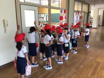3時間目の体育に間に合うように、自分達で声をかけ合いながら廊下に並んでいます。
